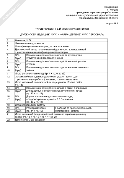 Тарификационный список работников муниципальных учреждений здравоохранения города Дубны Московской области. Должности медицинского и фармацевтического персонала (форма № 2)