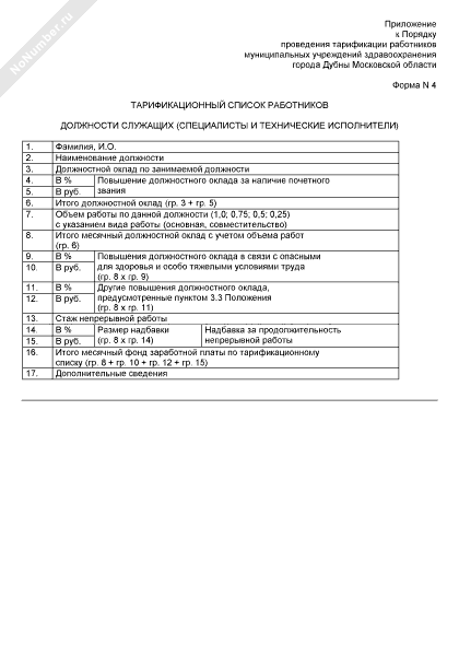 Тарификационный список работников муниципальных учреждений здравоохранения города Дубны Московской области. Должности служащих (специалисты и технические исполнители) (форма № 4)