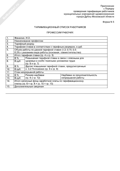Тарификационный список работников муниципальных учреждений здравоохранения города Дубны Московской области. Профессии рабочих (форма № 5)