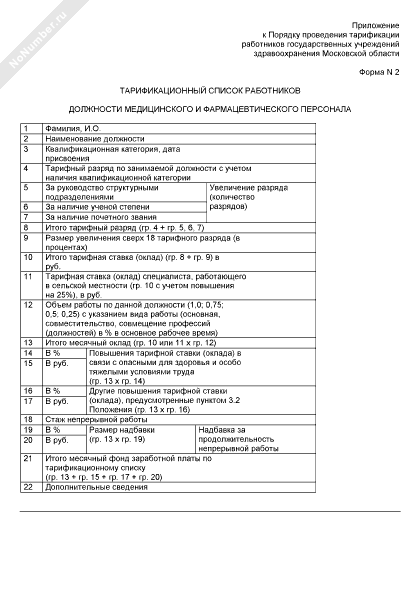 Тарификационный список работников. Должности медицинского и фармацевтического персонала (форма № 2)