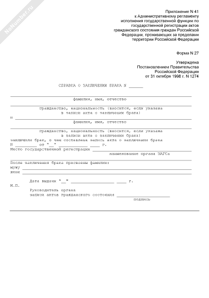 - 338Справка о заключении брака (для граждан Российской Федерации, проживающих за пределами территории Российской Федерации) (форма № 27)