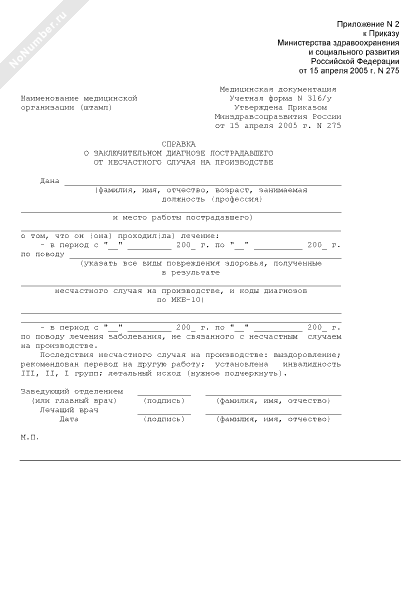 - 337Справка о заключительном диагнозе пострадавшего от несчастного случая на производстве. Учетная форма № 316/у