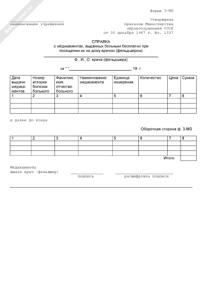 - 368Справка о медикаментах, выданных больным бесплатно при посещении их на дому врачом (фельдшером). Форма № 3-МЗ