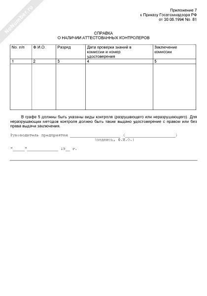 - 376Справка о наличии аттестованных контролеров (приложение к заявлению о выдаче временного разрешения на изготовление оборудования, трубопроводов, приборов и аппаратуры для объекта атомной энергетики)