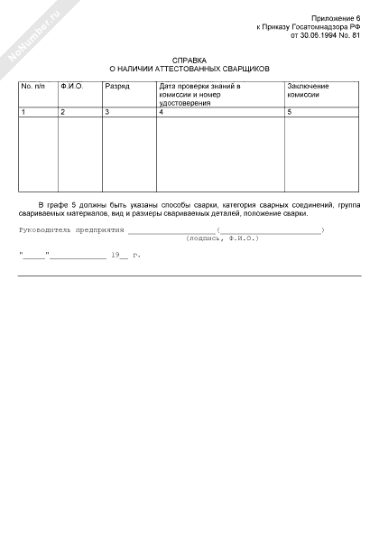 - 375Справка о наличии аттестованных сварщиков (приложение к заявлению о выдаче временного разрешения на изготовление оборудования, трубопроводов, приборов и аппаратуры для объекта атомной энергетики)