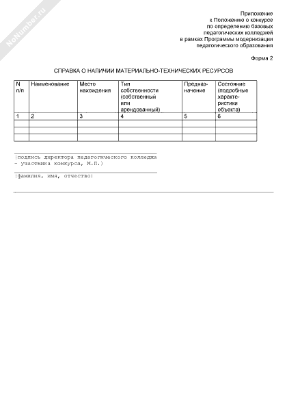 - 380Справка о наличии материально-технических ресурсов для участия в конкурсе по определению базовых педагогических колледжей в рамках программы модернизации педагогического образования (форма № 2)
