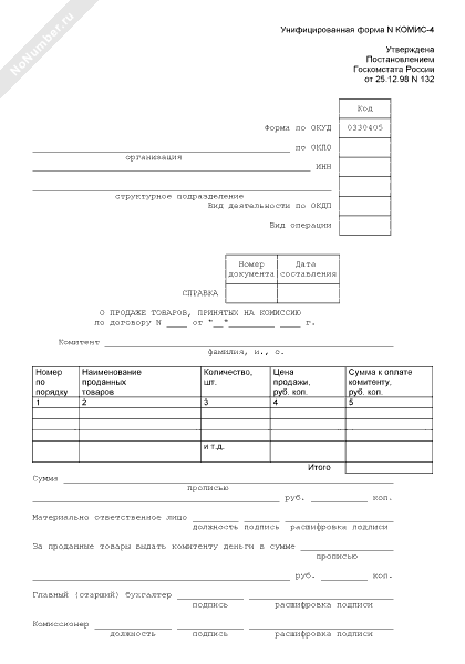 - 528Справка о продаже товаров, принятых на комиссию. Унифицированная форма № КОМИС-4