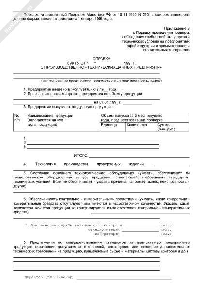 - 531Справка о производственно-технических данных предприятия к акту проверки соблюдения требований стандартов и технических условий на предприятии