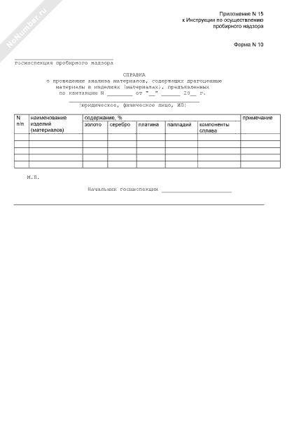 - 523Справка о проведении анализа материалов, содержащих драгоценные материалы в изделиях (материалах), предъявленных по квитанции юридическим, физическим лицом, ИП (форма № 10)