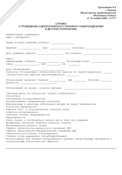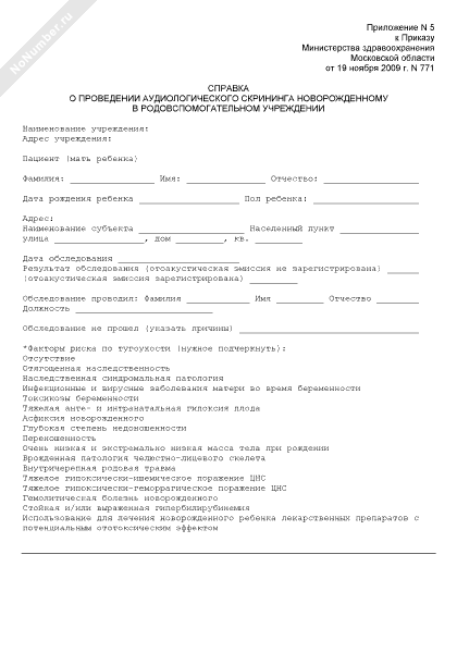 - 527Справка о проведении аудиологического скрининга новорожденному в детской поликлинике Московской области