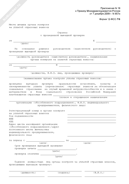 - 525Справка о проведенной выездной проверке правильности исчисления, полноты и своевременности уплаты (перечисления) страховых взносов на обязательное социальное страхование на случай временной нетрудоспособности и в связи с материнством в Фонд социального страхования Российской Федерации. Форма № 12-ФСС РФ