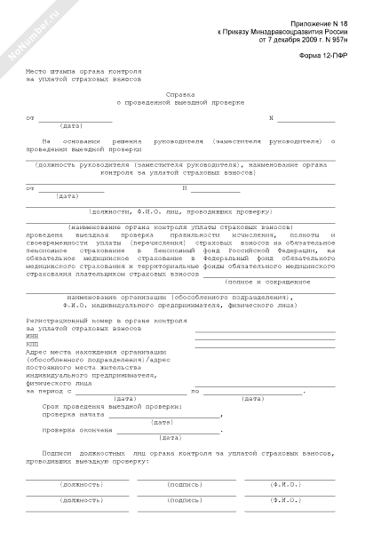 - 524Справка о проведенной выездной проверке правильности исчисления, полноты и своевременности уплаты (перечисления) страховых взносов плательщиком. Форма № 12-ПФР