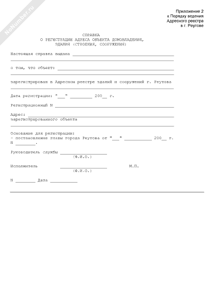 - 591Справка о регистрации адреса объекта домовладения, здания (строения, сооружения) на территории города Реутова Московской области
