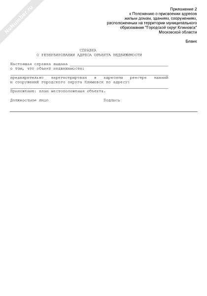 - 596Справка о резервировании адреса объекта недвижимости муниципального образования «Городской округ Климовск» Московской области