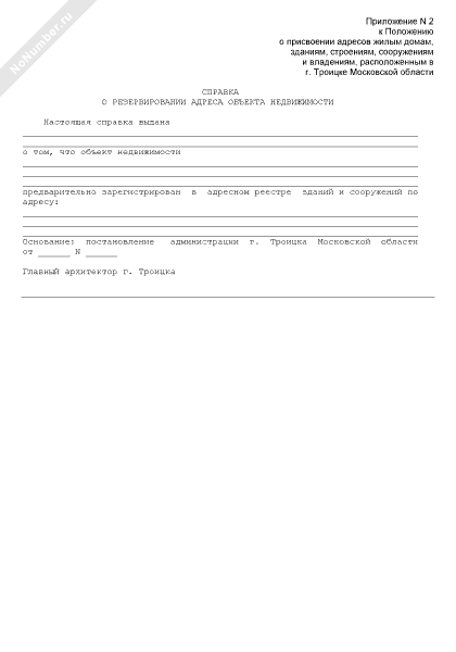 - 598Справка о резервировании адреса объекта недвижимости, расположенного в г. Троицке Московской области