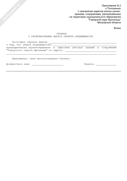 - 594Справка о резервировании адреса объекта недвижимости, расположенного на территории муниципального образования «Городской округ Бронницы» Московской области