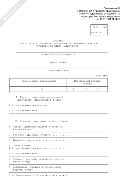 - 600Справка о результатах проверки соблюдения предприятием порядка работы с денежной наличностью