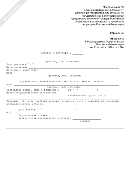 - 627Справка о рождении (для граждан Российской Федерации, проживающих за пределами территории Российской Федерации) (форма № 25)