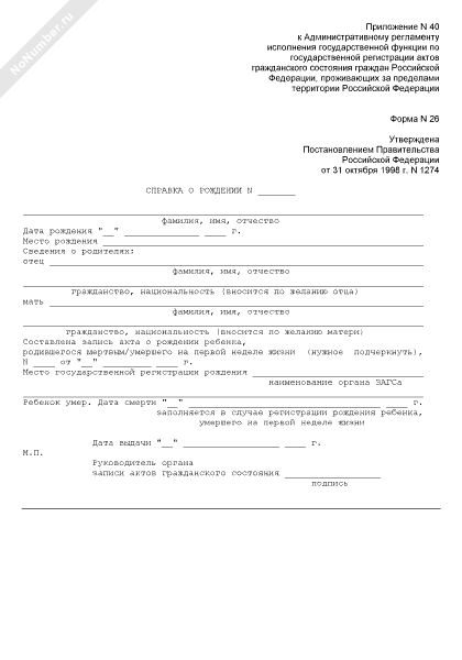 - 628Справка о рождении (для граждан Российской Федерации, проживающих за пределами территории Российской Федерации) (форма № 26)
