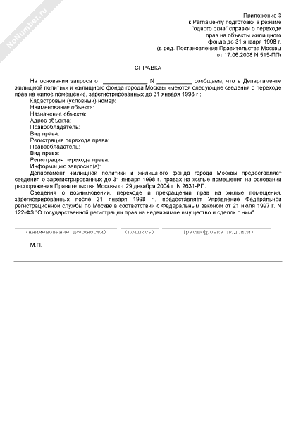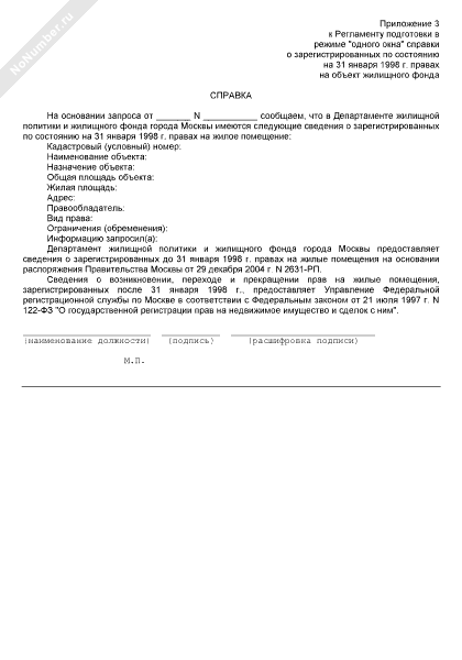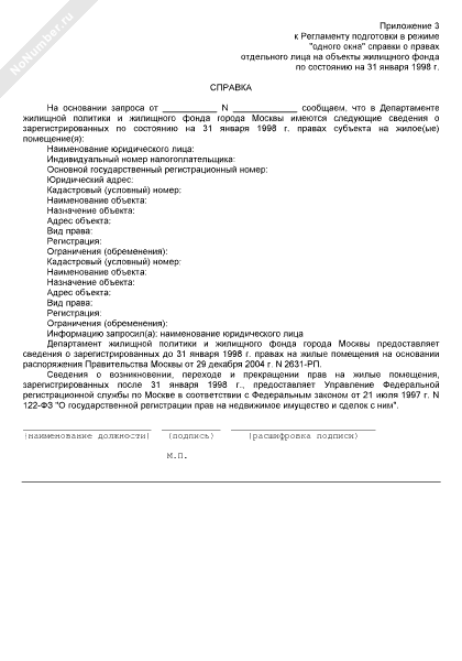 - 845Справка об имеющихся сведениях о переходе прав на жилое помещение, зарегистрированных до 31 января 1998 г. в режиме «одного окна» по городу Москве