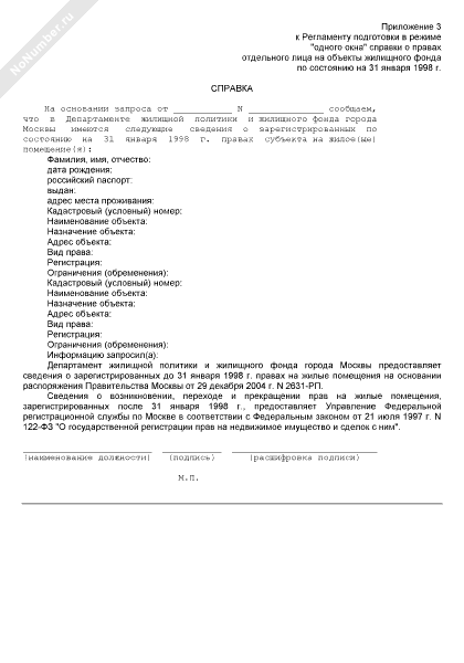 - 842Справка об имеющихся сведениях о зарегистрированных по состоянию на 31 января 1998 г. правах на жилое помещение в режиме «одного окна» по городу Москве