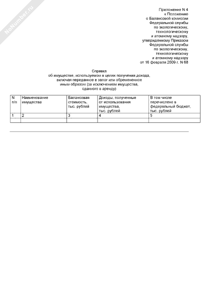 - 851Справка об имуществе, используемом в целях получения дохода, включая переданное в залог или обремененное иным образом (за исключением имущества, сданного в аренду), представляемая федеральными государственными унитарными предприятиями и федеральными государственными учреждениями, находящимися в ведении Федеральной службы по экологическому, технологическому и атомному надзору, для рассмотрения Балансовой комиссией