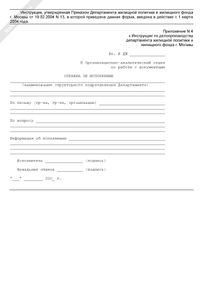 - 858Справка об исполнении документа в структурном подразделении Департамента жилищной политики и жилищного фонда г. Москвы