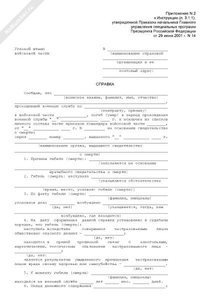 - 874Справка об обстоятельствах наступления страхового случая и сведения о застрахованном лице (военнослужащем) в случае смерти до истечения одного года после увольнения с военной службы вследствие увечья (ранения, травмы, контузии) или заболевания, полученных в период прохождения военной службы