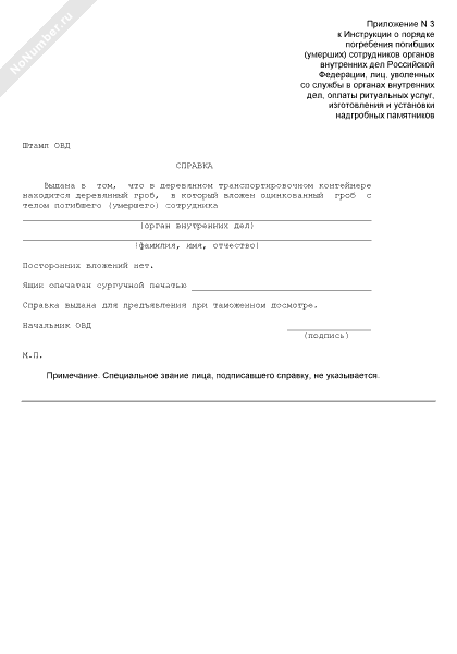 - 958Справка об отсутствии посторонних вложений в контейнере и в гробе с телом погибшего (умершего) сотрудника органов внутренних дел Российской Федерации