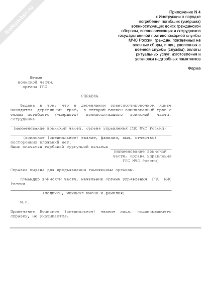 - 953Справка об отсутствии в гробу и ящике посторонних вложений погибшего (умершего) военнослужащего войск гражданской обороны (военнослужащего или сотрудника государственной противопожарной службы МЧС России, гражданина, призванного на военные сборы, и лица, уволенного с военной службы (службы))