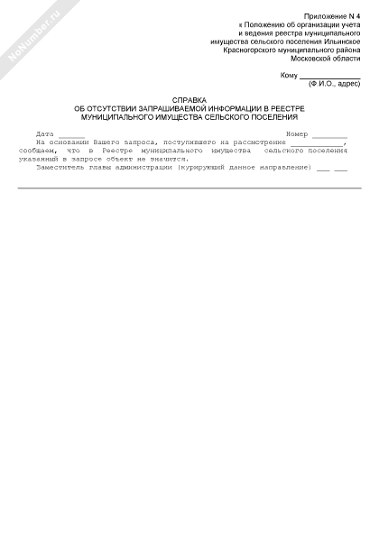 - 946Справка об отсутствии запрашиваемой информации в реестре муниципального имущества сельского поселения Ильинское Красногорского района Московской области