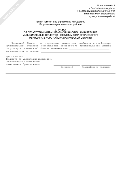 - 954Справка об отсутствии запрашиваемой информации в реестре муниципальных объектов недвижимости Егорьевского муниципального района Московской области