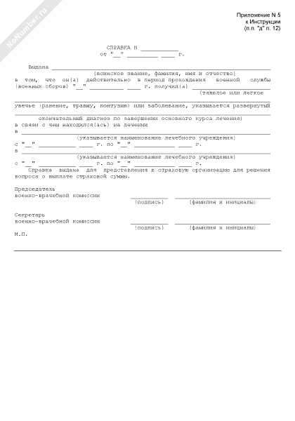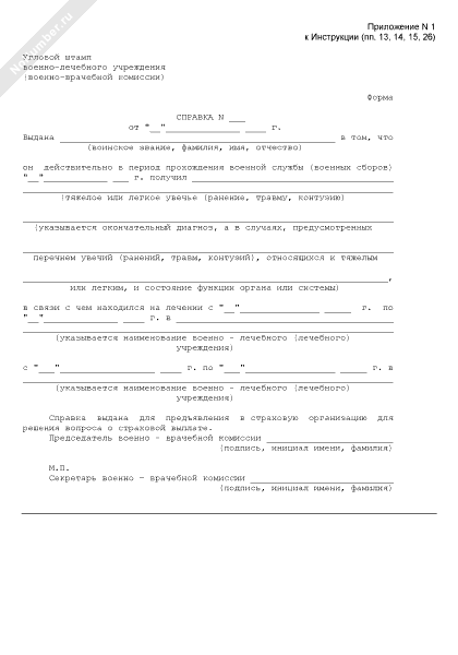 - 90Справка военно-врачебной комиссии, свидетельствующая о получении тяжелого или легкого увечья (ранения, травмы, контузии) в период прохождения военной службы (военных сборов), для решения вопроса о страховой выплате