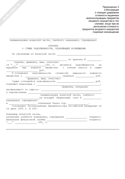 - 95Справка военнослужащему, уволенному из воинской части о сумме задолженности, подлежащей возмещению