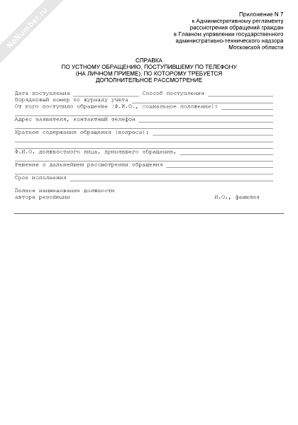 - 1044Справка по устному обращению в главное управление Госадмтехнадзора Московской области, поступившему по телефону (на личном приеме), по которому требуется дополнительное рассмотрение