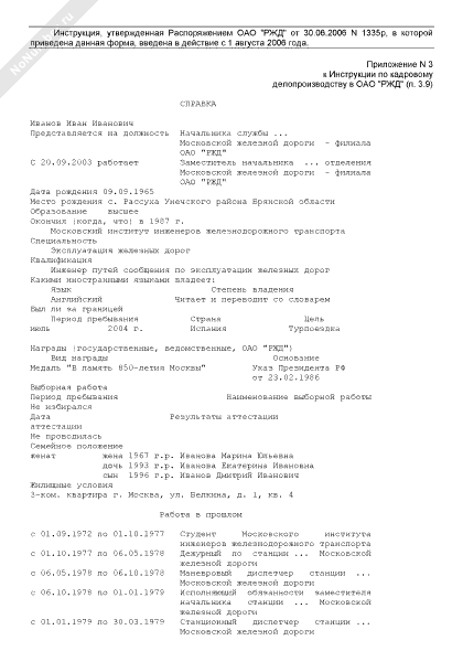 - 1048Справка при приеме на работу в открытое акционерное общество «Российские железные дороги», отражающая социально-демографические сведения о работнике и его работу в прошлом