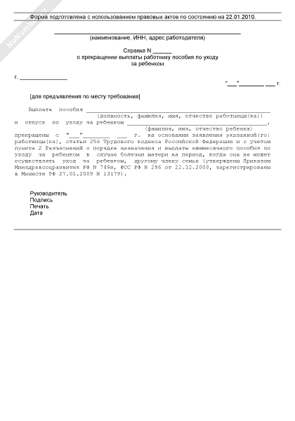 - 1049Справка работодателя о том, что работнику прекратили выплачивать пособие по уходу за ребенком