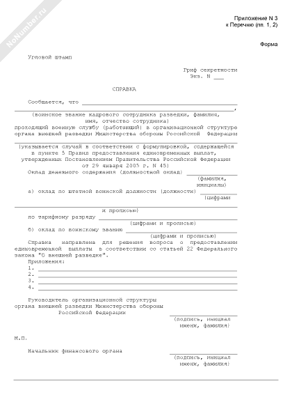 - 1052Справка руководителя организационной структуры органа внешней разведки Министерства обороны Российской Федерации об обстоятельствах причинения вреда здоровью кадрового сотрудника разведки или члена его семьи и размере оклада денежного содержания (должностного оклада) кадрового сотрудника разведки