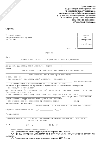 - 1074Справка Федеральной миграционной службы иностранному гражданину в том, что его документ, удостоверяющий личность, находится в территориальном органе ФМС России для проставления отметки о разрешении на временное проживание в Российской Федерации