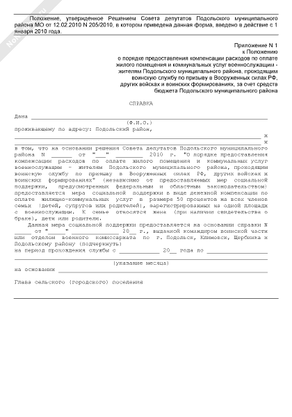- 1062Справка семье военнослужащего, проходящего службу по призыву и зарегистрированного на территории Подольского муниципального района Московской области, для получения компенсации расходов по оплате жилого помещения и коммунальных услуг