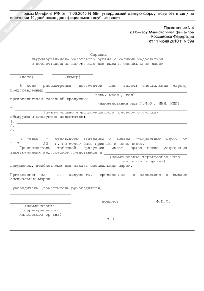 - 1064Справка территориального налогового органа о наличии недостатков в представленных документах для выдачи специальных марок для маркировки табачной продукции