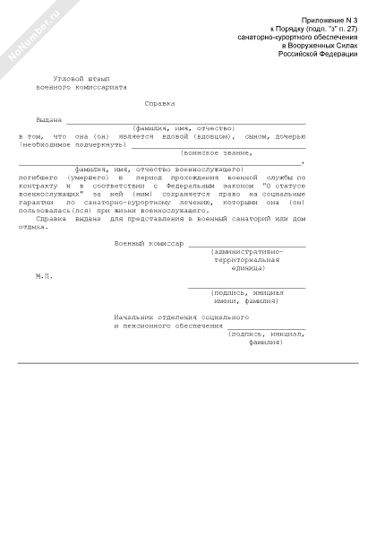 - 1122Справка, удостоверяющая родственное отношение к военнослужащему, погибшему (умершему) в период прохождения военной службы по контракту, выданная военным комиссариатом для предоставления санаторно-курортного лечения