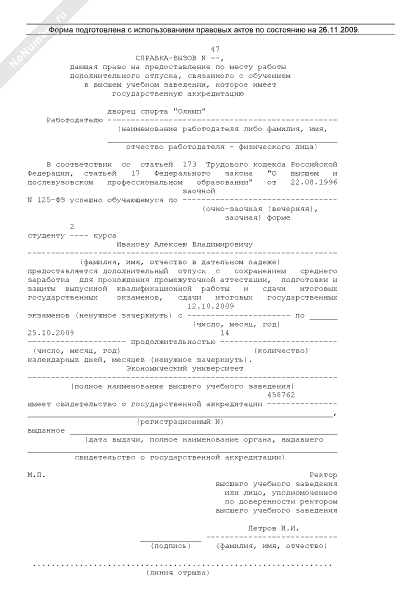 - 1128Справка-вызов (вместе со справкой-подтверждением), дающая право на предоставление по месту работы дополнительного отпуска, связанного с обучением в высшем учебном заведении, которое имеет государственную аккредитацию