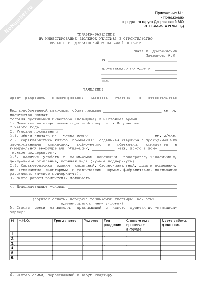 - 1138Справка-заявление на инвестирование (долевое участие) в строительство жилья в г. Дзержинский Московской области