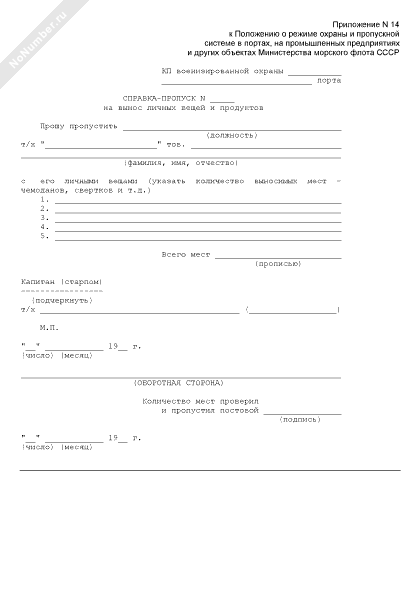 - 1147Справка-пропуск на вынос личных вещей и продуктов на промышленных предприятиях и других объектах Министерства морского флота СССР