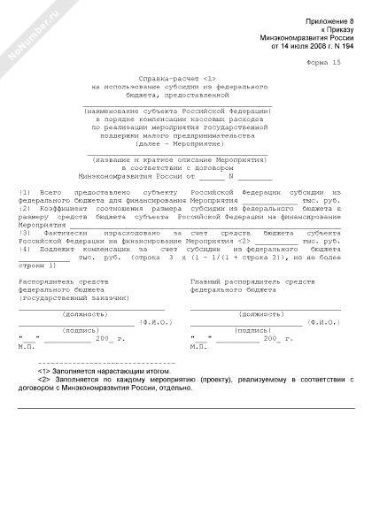 - 1150Справка-расчет на использование субсидии из федерального бюджета, предоставленной субъектУ Российской Федерации в порядке компенсации кассовых расходов по реализации мероприятия государственной поддержки малого предпринимательства в соответствии с договором Минэкономразвития России (форма № 15)
