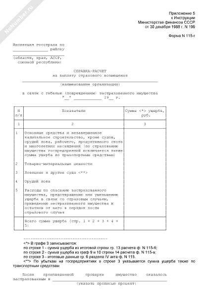 - 1149Справка-расчет на выплату страхового возмещения в связи с гибелью (повреждением) застрахованного имущества. Форма № 115-Г