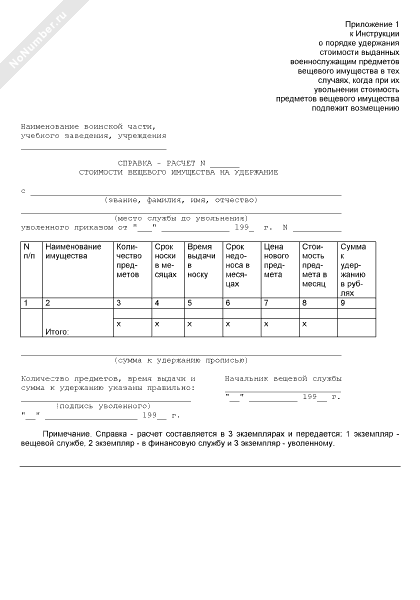 - 1153Справка-расчет стоимости вещевого имущества на удержание, выданная военнослужащему, уволенному из воинской части