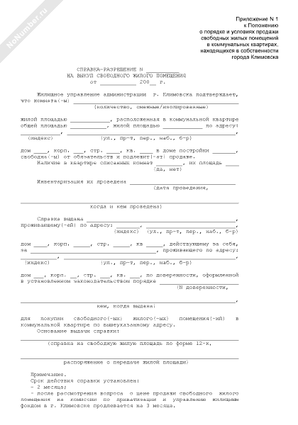 - 1148Справка-разрешение на выкуп свободного жилого помещения, расположенного в коммунальной квартире на территории г. Климовска Московской области