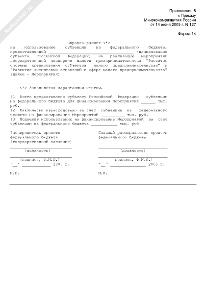 - 1182Справка-расчет на использование субвенции из федерального бюджета, предоставленной субъекту Российской Федерации на реализацию мероприятий государственной поддержки малого предпринимательства «Развитие системы кредитования субъектов малого предпринимательства» и «Развитие лизинговых отношений в сфере малого предпринимательства» (форма № 14)